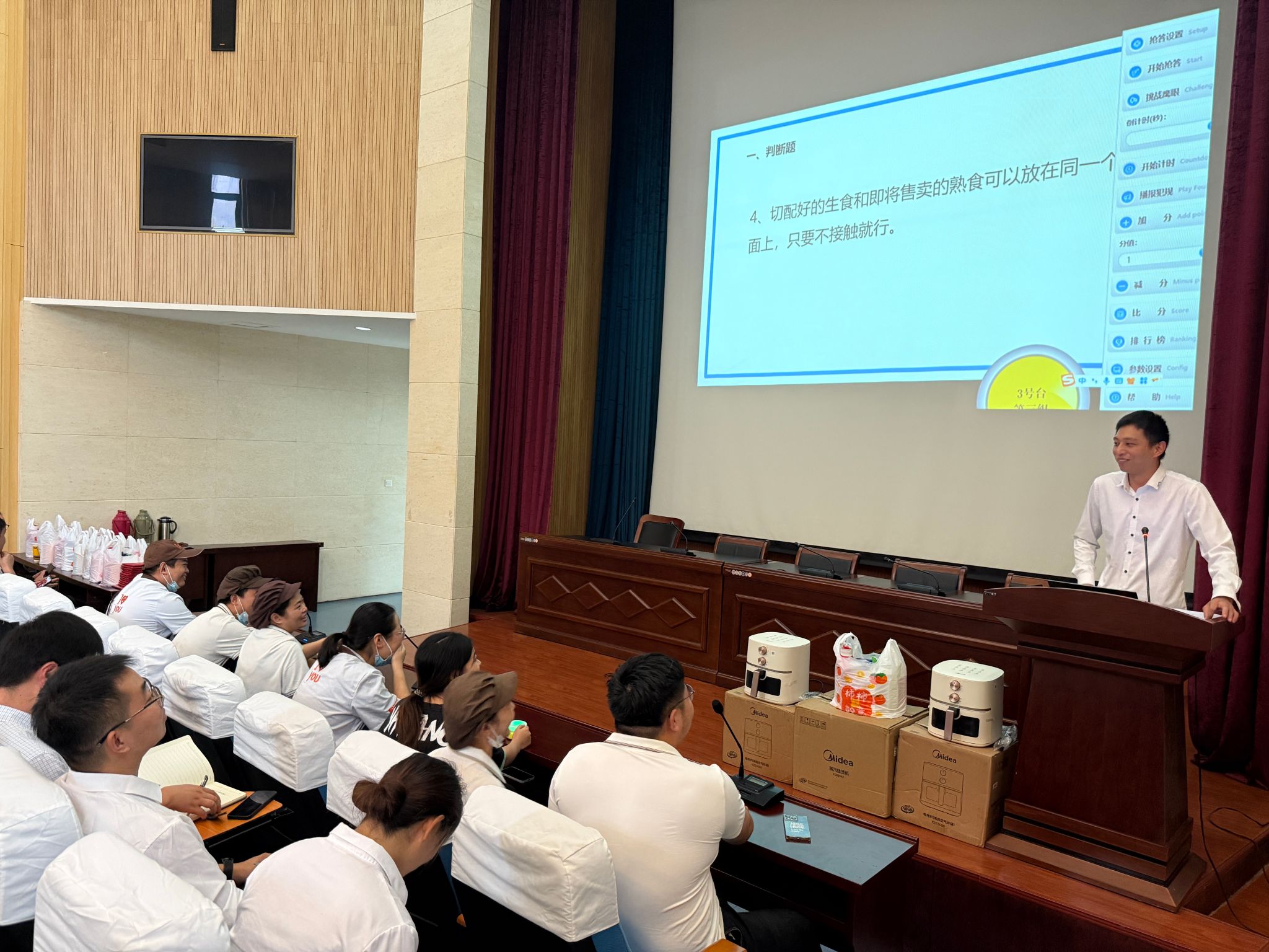 随后的有奖抢答环节将现场气氛推向高潮。主持人宣读题目后,各餐饮企业代表队按下抢答器争先作答,所有题目均选自后勤处日常监督检查发现的食品安全隐患,让从业人员指出问题所在,并回答整改措施,题目覆盖日常操作全流程。