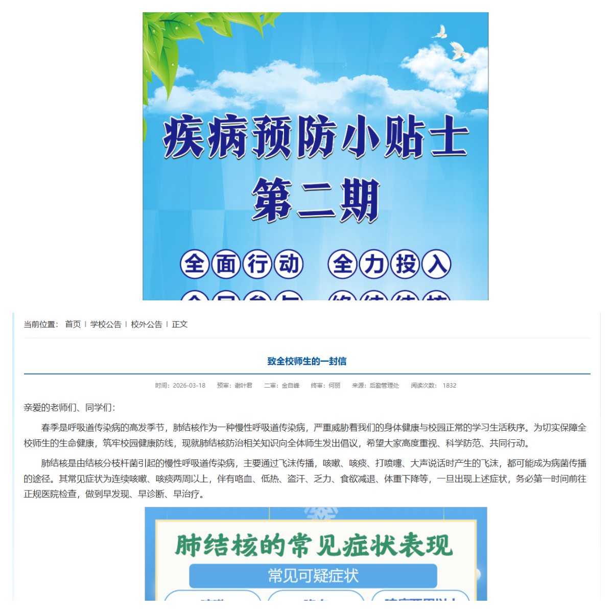 针对高校师生群体特点,学校依托官网、校医院网站、一站式社区等平台,打造全天候、便捷化的科普宣传阵地,让结核病防治知识触手可及。通过发布科普视频、结核病防治知识系列读本、疾病预防小贴士、致全校师生的一封信等宣传内容,聚焦结核病发病症状、传播途径、预防措施、国家免费诊疗政策及常见认知误区等核心要点,以通俗易懂、生动鲜活的形式传递专业知识,打破时空限制,实现全校师生宣传教育全覆盖。